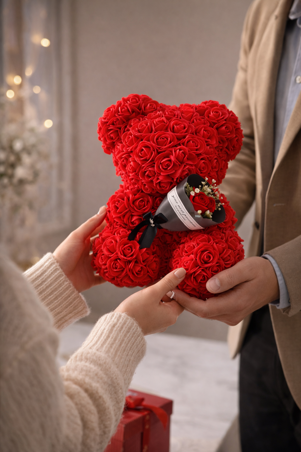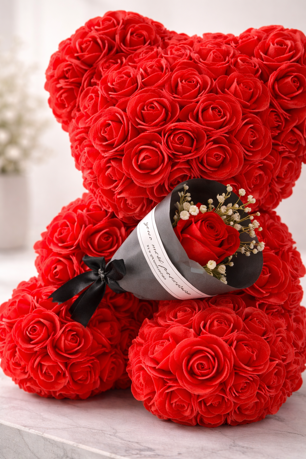 Composé de roses artificielles en mousse, l'Ours Éternel conserve son apparence jour après jour, sans entretien, pour durer bien au-delà du moment où il est offert.
